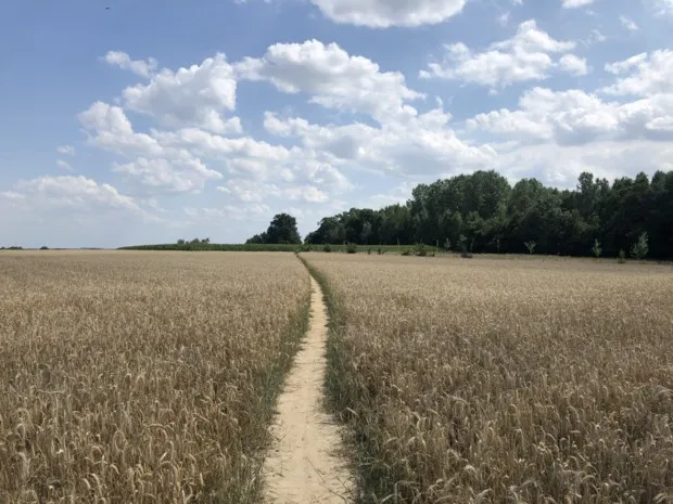 Ondertussen zijn we van seizoen geruild, en ziet de Nok er anders uit. De droge, hobbelige akker is nu weelderig begroeid. Vanaf de kapel doorklieft het wandelpad pijlrecht twee velden. Eerst eentje met graan dat wiegt in de wind, daarna baan je je een weg door een menshoog maïsveld. Maar oef, dat uitzicht blijft onveranderd mooi. Eens het gapen achter de rug, kan je op het zanderige pad de gele pijltjes van een zes kilometer lange wandeling beginnen volgen. Van - nu ja - piek naar dal, van Hasselt naar Alken en terug. Waar je prompt in de vallei van de rustig kabbelende Mombeek belandt. Altijd goed voor wat gezweet en een klein gelukje.