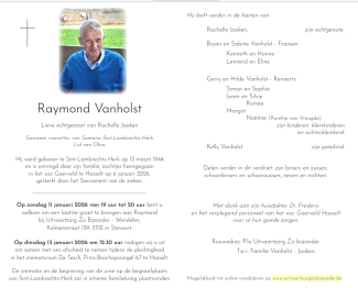 We bieden aan de kinderen, de ganse familie ons diep meeleven aan. Raymond blijft voor ons de behulpzame, vriendelijke, attente zoon van een (half)neef Gas van onze pa Clement. Hij en wij voelden "familieband".