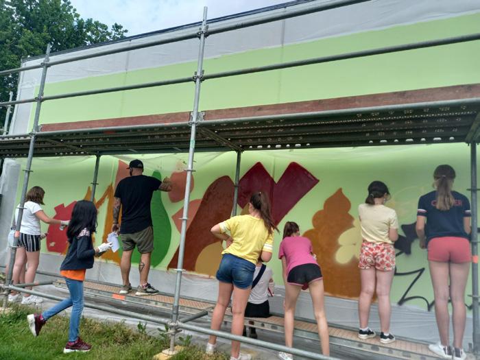 Daarna begon het echte werk. In kleine groepjes, volledig Coronaproof, mochten de leerlingen met spuitbussen aan de slag. Ook TV Limburg kwam een kijkje nemen en liet in een reportage tijdens het middagnieuws al een stukje van het kunstwerk zien. Kunstenaar, leerlingen, leerkrachten en De Vrienden van De Beemdgalm waren laaiend enthousiast over de samenwerking en fier op het geleverde werk.