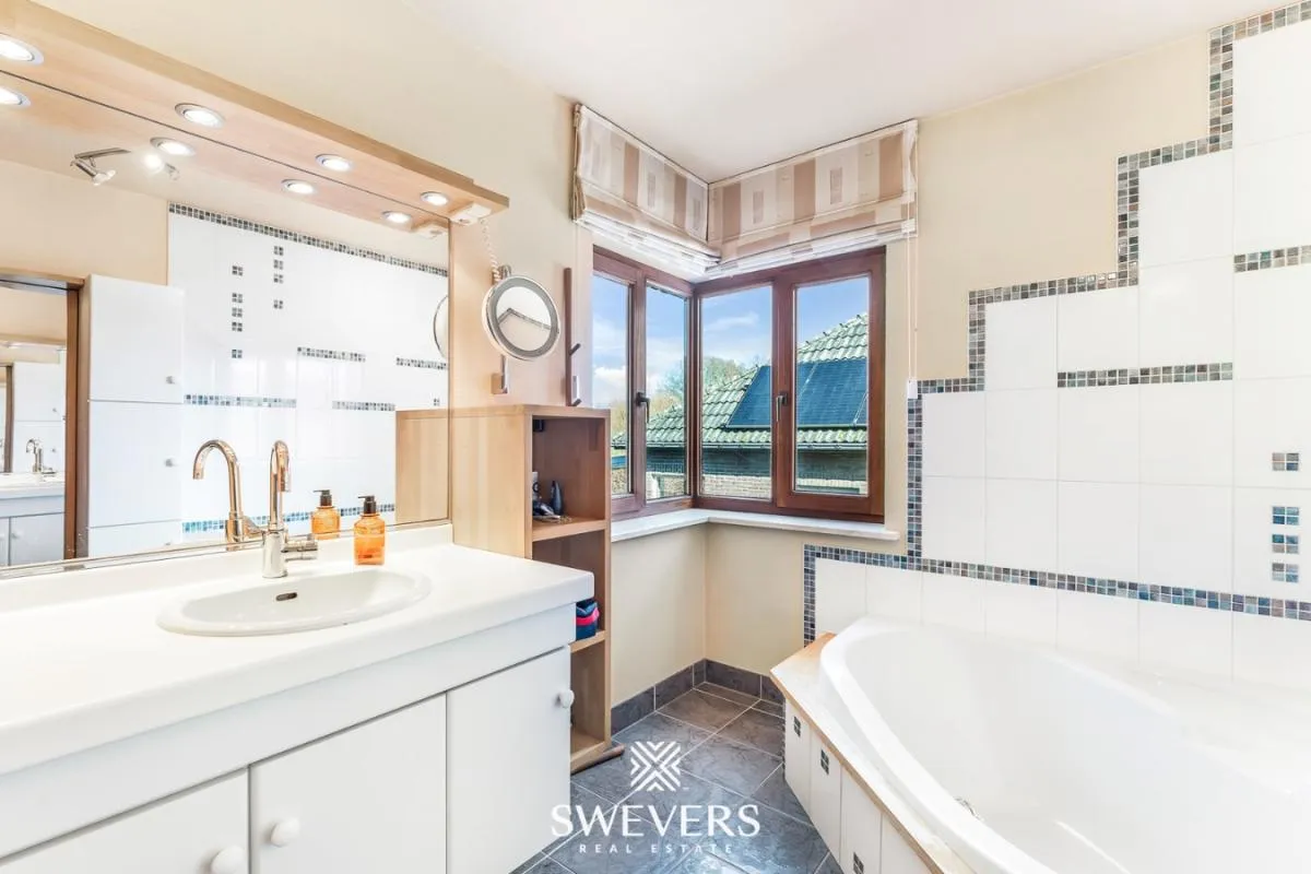 Verder op het gelijkvloers is er een handige berging en een wasruimte op niveau -80 cm, uitgerust met aansluitingen voor wasmachine, droogkast en waterverzachter. De dubbele garage van 29 m² biedt extra bergruimte en is vlot bereikbaar via de oprit aan de rechterzijde van de woning. In de woning zelf zijn maar liefst vier toiletten voorzien, wat het praktische aspect versterkt.