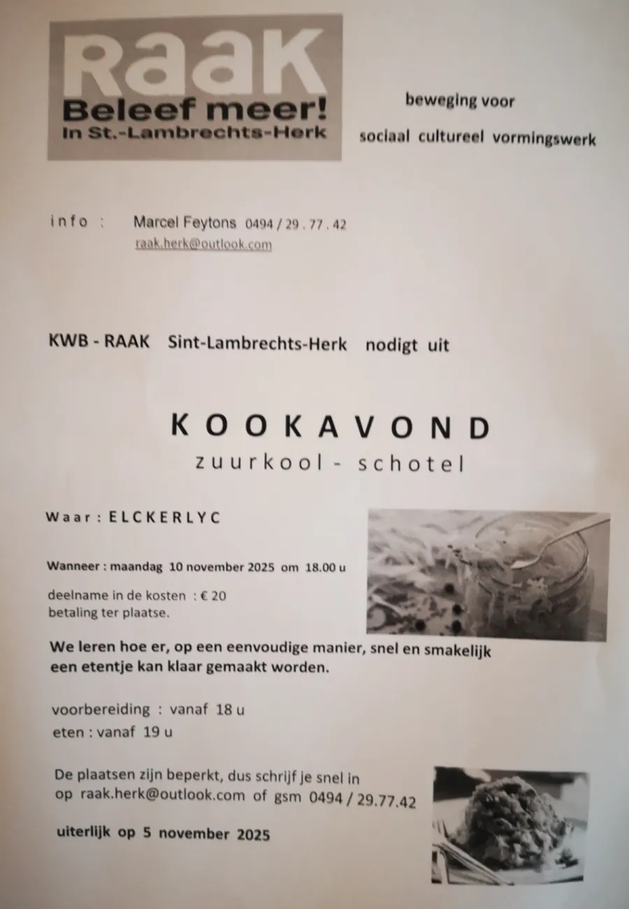 KWB-RAAK Sint-Lambrechts-Herk nodigt uit KOOKAVOND