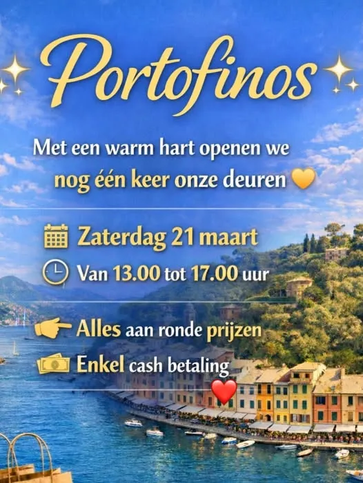 19 maart 2026 Na iets meer dan 16 jaar sloot Portofinos eind januari de deuren. Op zaterdag 21 maart gaan de deuren nog eenmaal open van 13u tot 17u. 1 weergave