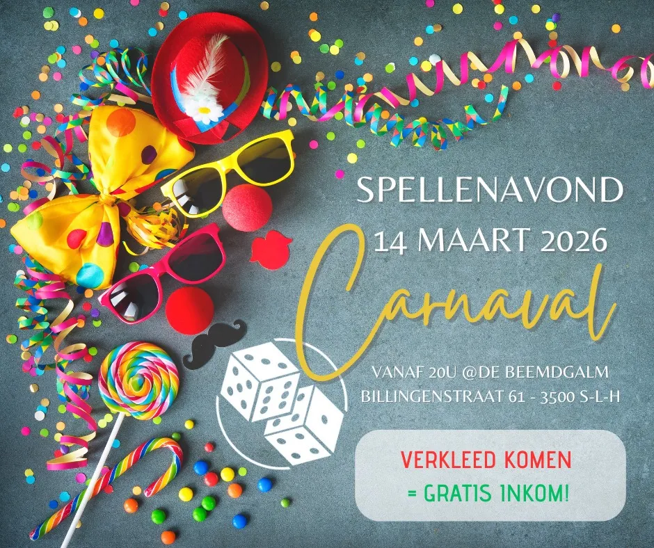 Zoek dus alvast je leukste carnavalsoutfit en neem je vrienden, familie, buren, collega's ... mee naar onze spellenavond van maart! Of kom gerust alleen, wij vinden dan wel een tafel waarbij je kan aansluiten.