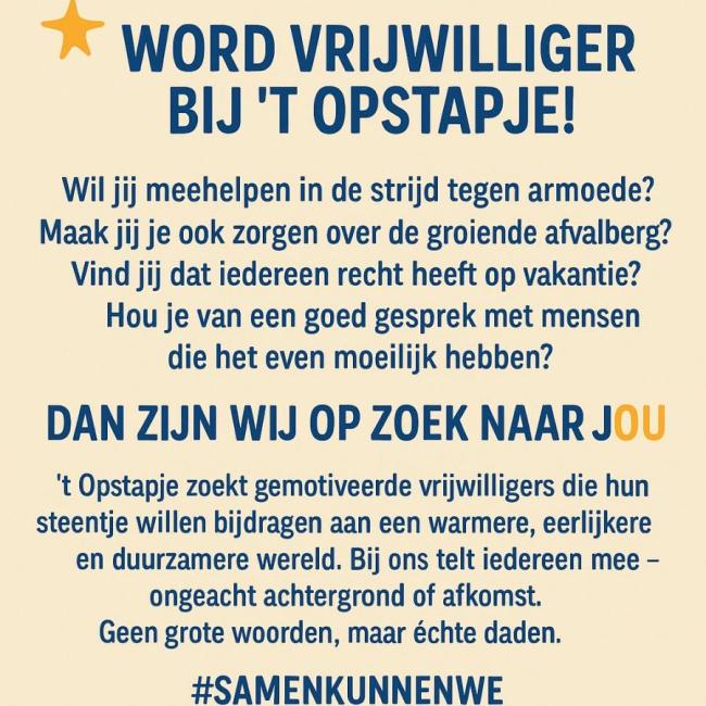 ’t Opstapje zoekt gemotiveerde vrijwilligers die hun steentje willen bijdragen aan een warmere, eerlijkere en duurzamere wereld.