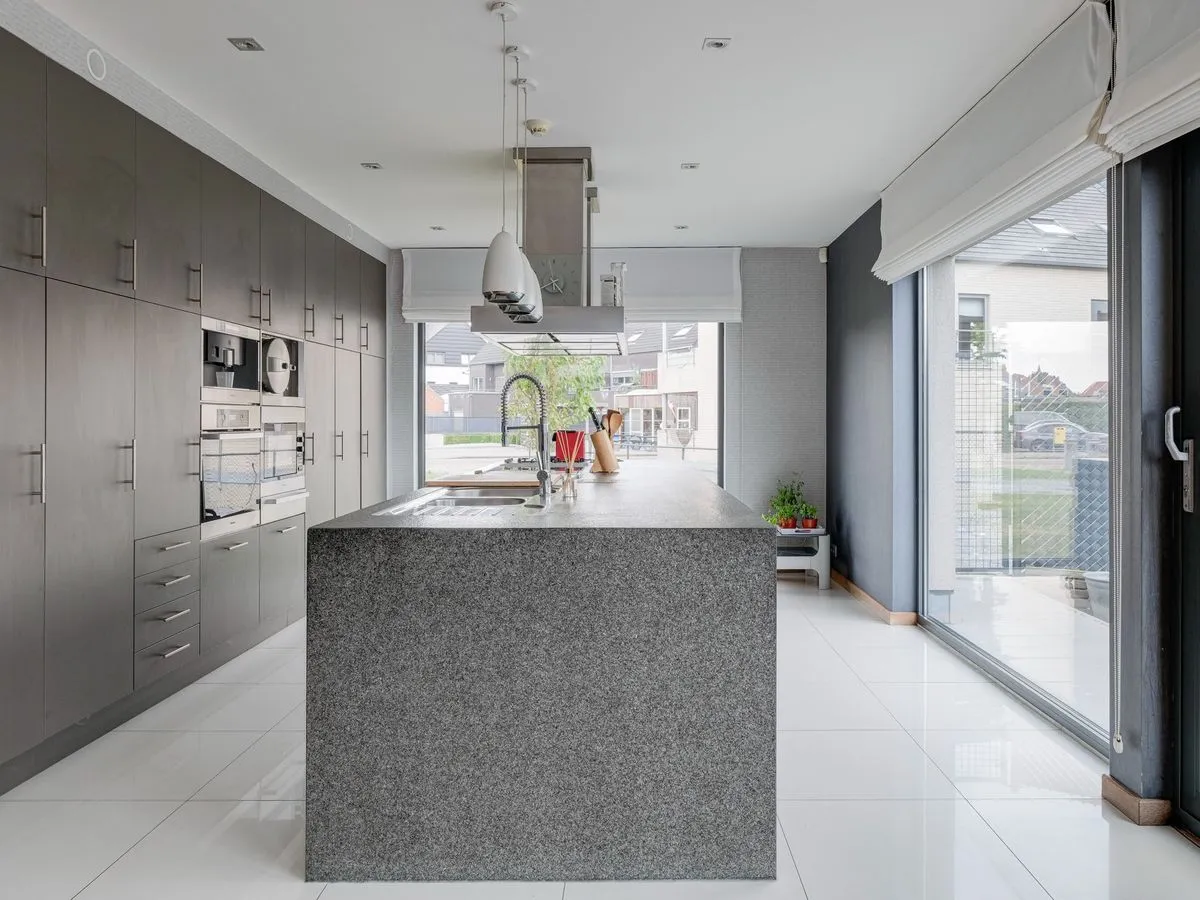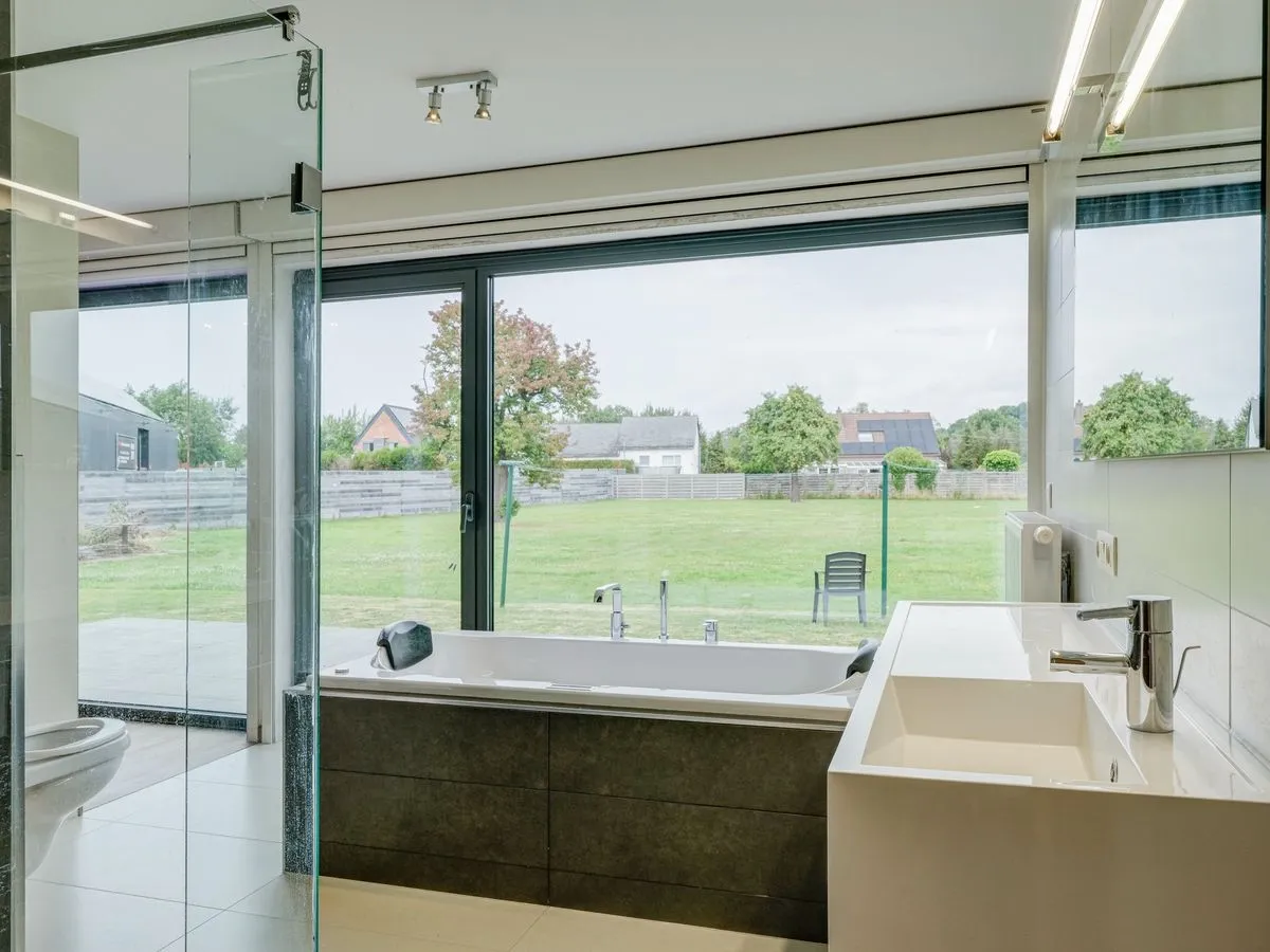 De leefruimte is bijzonder aangenaam en lichtrijk, met grote raampartijen en een sfeervolle gashaard als blikvanger. De open keuken is volledig uitgerust en sluit mooi aan op de eet- en zithoek. Aansluitend bevindt zich een gastentoilet en een praktische bureauruimte, ideaal voor thuiswerk of als hobbykamer/5e slaapkamer.