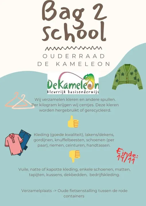 Heb je de kleerkasten opgeruimd? Ideaal, je kan de zakken aan de rode containers aan school plaatsen en dit nog tot en met woensdag 19/11.