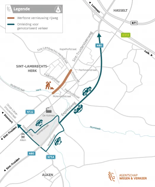 Het Agentschap Wegen en Verkeer (AWV) vernieuwt tijdens de paasvakantie de N722 Sint-Truidersteenweg in de dorpskern van Sint-Lambrechts-Herk, tussen waterloop de Herk en de Kapelhofstraat. De werken starten op maandag 5 april. Gedurende twee weken is de gewestweg plaatselijk afgesloten voor gemotoriseerd verkeer.