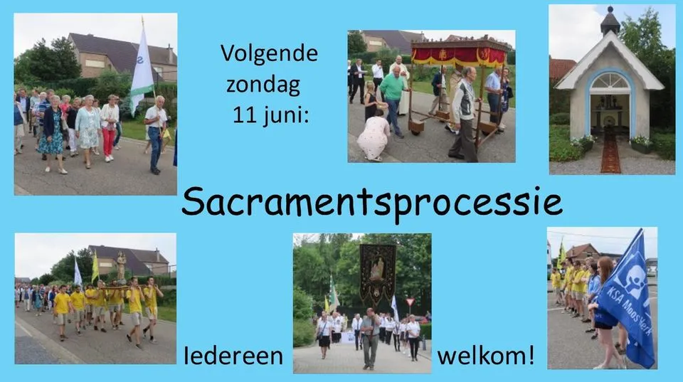 Volgende zondag, 11 juni, is er de jaarlijkse Sacramentsprocessie. Vertrek aan de kerk om 10u. Parcours: Pastorijstraat, Graaf de Brigodestraat, Sint-Lambrechts-Herkstraat, Hogebergstraat, Billingenstraat, slotmoment in het amfitheater van de Beemdgalm.