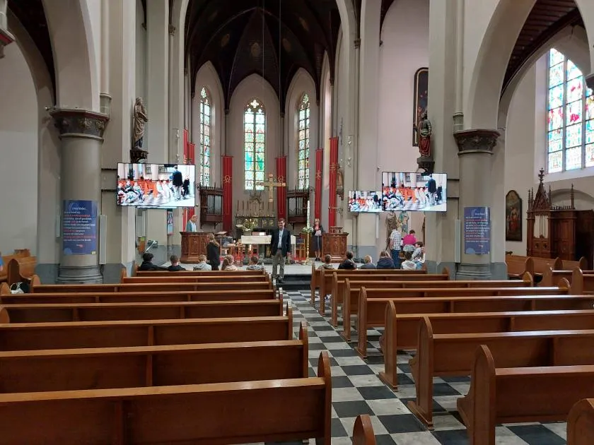 De kerkfabriek heeft in de kerk 4 (video)schermen geplaatst, waardoor de service voor de gelovigen en voor de bezoekers van socio-culturele activiteiten in de kerk vergroot wordt.
