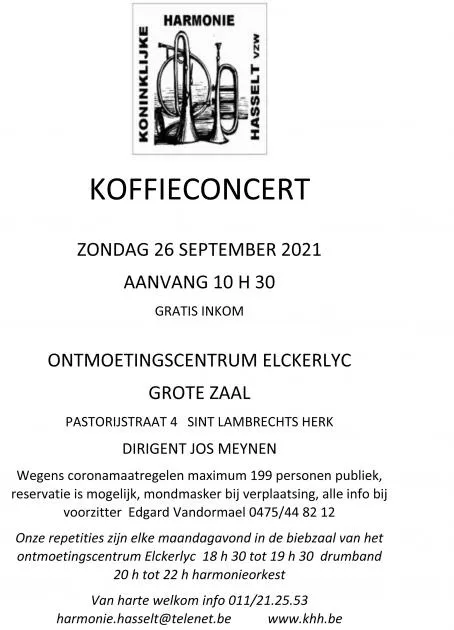 De Koninklijke Harmonie Hasselt is sinds 23 juni na een lange periode van lockdown haar repetities terug opgestart, sinds 19 juli hebben wij een vaste repetitieruimte in de voormalige bibliotheekzaal van het ontmoetingscentrum Elckerlyc. Dit elke maandagavond, drumband repeteert van 19 h 30 tot 20 h 30, het harmonieorkest van 20 h tot 22 h.