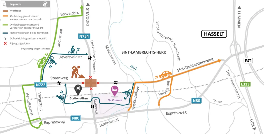 Van maandag 28 juli tot half september is het kruispunt van de Steenweg met de Stationsstraat afgesloten. AWV vernieuwt dan het kruispunt met gescheiden riolering, nieuwe verkeerslichten, oversteekplaatsen voor fietsers en voetgangers en vrijliggende fietspaden.