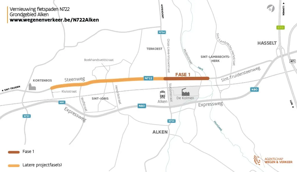 Een uitgebreide projectomschrijving en de ontwerpplannen vind je op www.wegenenverkeer.be/N722Alken