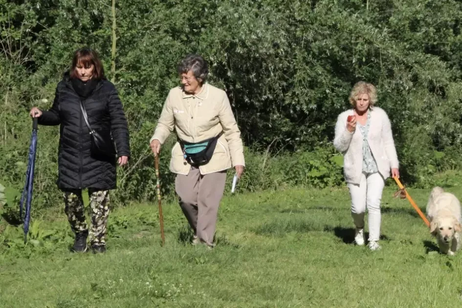 Rooske (84), Marijke en Marita zijn samen met golden retriever Mila op de afspraak: “We wandelen graag en we helpen graag, daarom hebben we onze wandelschoenen met veel enthousiasme aangetrokken”, zeggen de Herkse dames.
