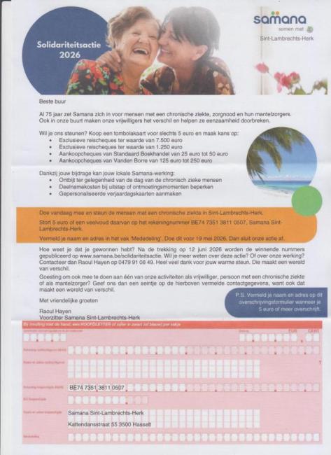 Na de trekking op 12 juni 2026 worden de winnende nummers gepubliceerd op www.samana.be/solidariteitsactieWil je meer weten over deze actie? Of over onze werking? Contacteer dan Raoul Hayen op 0479 91 08 49. Heel veel dank voor jouw warme steun. Die maakt een wereld van verschil.