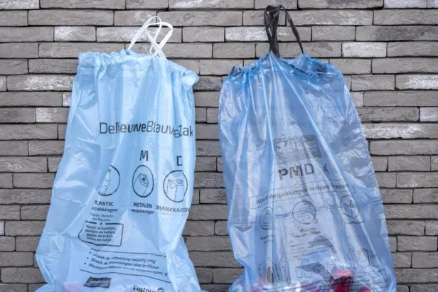 Oude blauwe PMD-zakken, te herkennen aan het zwart treklint, worden sinds 1 januari niet meer aan huis opgehaald.