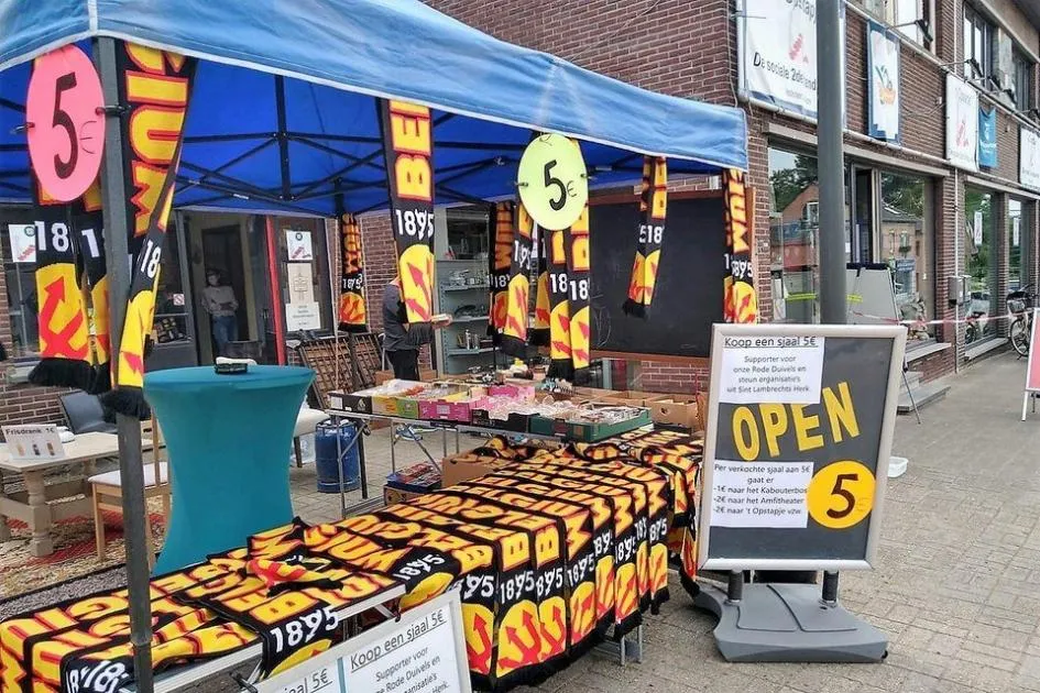 Tijdens het EK voetbal verkochten vrijwilligers sjaals voor 5 euro ten voordele van drie organisaties in Sint-Lambrechts-Herk.