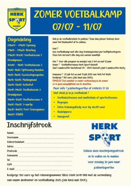 Van 7 t.e.m. 11 juli organiseert Voetbalvereniging Herk Sport Hasselt opnieuw een spetterend voetbalkamp op het Beukenhof!