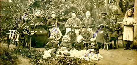 Foto van 1916 tijdens de eerste wereldoorlog met dames van Sint-Lambrechts-Herk aan het spinnenwiel. Deze huisarbeid van 100 jaar geleden bood een extra inkomen voor ongeschoolde vrouwen