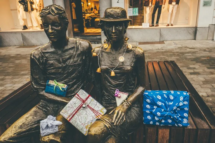 We willen zowel handelaars als consumenten inspireren over hergebruik en een decoratief alternatief voor wegwerp-cadeauverpakking tonen. Zo creëer je immers unieke, originele geschenken. Hiervoor gebruiken we twee technieken: Furoshiki & oude affiches. Furoshiki is een eenvoudige Japanse inpaktechniek met stof. Wij geven op die manier afgedankte stadswimpels en vlaggen een toffe, nieuwe bestemming.